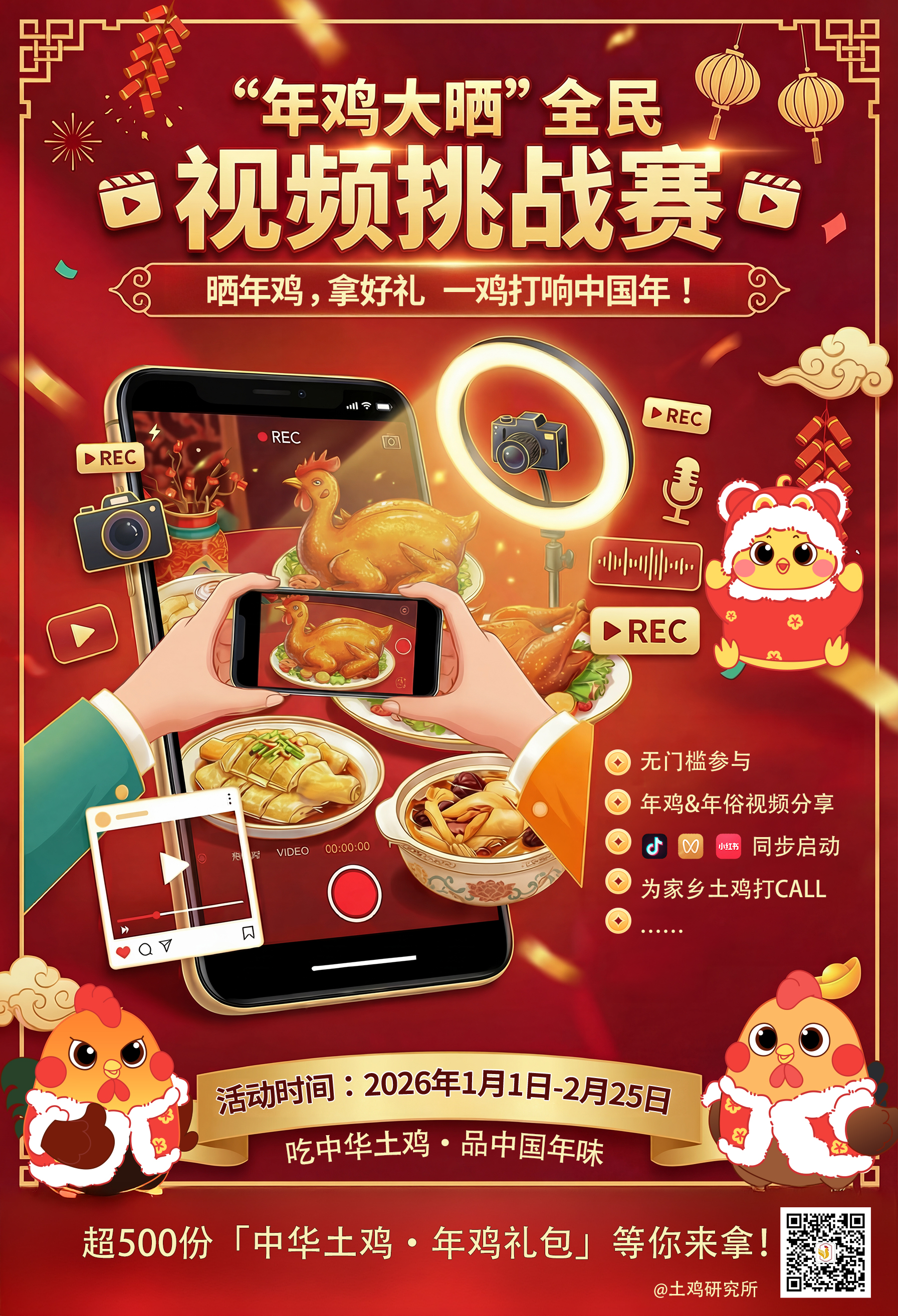 活動(dòng)從2026年1月1日持續(xù)至2月25日。參與者只需在抖音、視頻號(hào)或小紅書發(fā)布與“年雞”(如展示土雞、記錄習(xí)俗、烹飪菜肴、展現(xiàn)團(tuán)圓場(chǎng)景等)相關(guān)的原創(chuàng)短視頻,在文案中添加 #中華土雞、#年雞大曬 兩個(gè)話題,并@土雞研究所官方賬號(hào),即可成功參賽。