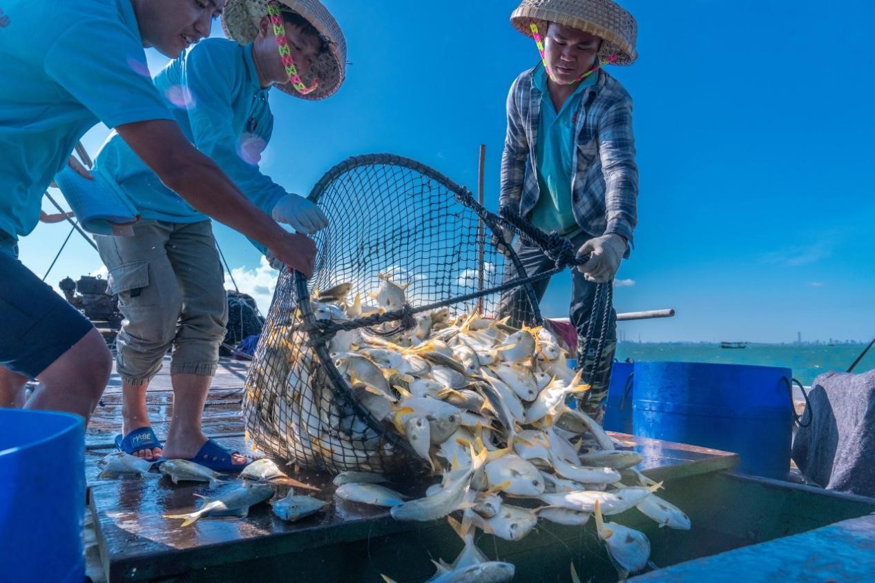 南海之濱,漁獲滿倉(cāng),廣東漁民在碧海藍(lán)天下收獲滿滿一網(wǎng)金鯧魚(yú)